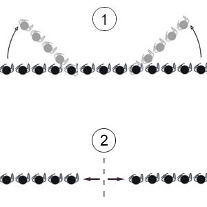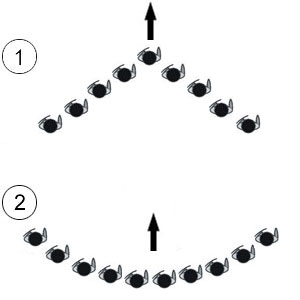 Auf „Marsch“ klappen die Flanken in Richtug der Gegnerischen Linie ein (1), dabei sind die Flanken wie eine Zange zu sehen, die sich schließt – typische Zangenbewegung.